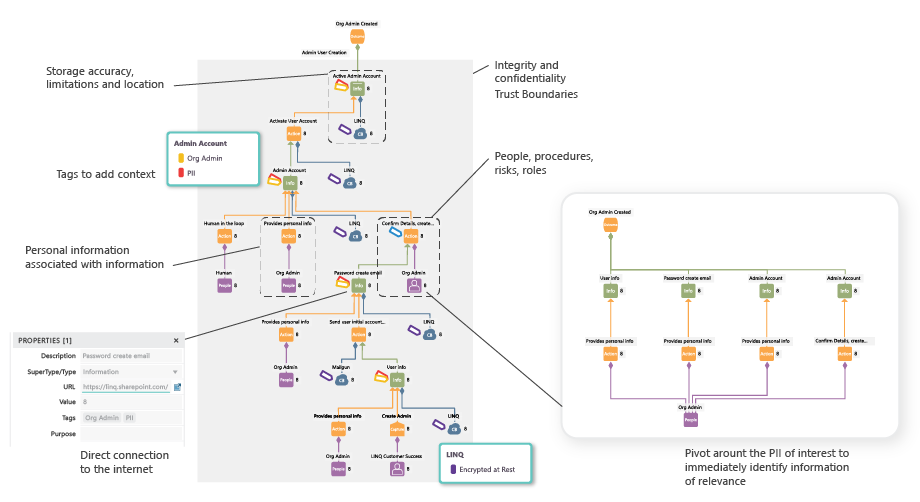 LINQ enables organisations to model information flow and gain insight from this new view of their business. Our platform has been designed to reduce the time from capture to insight through a methodology which enables trans-organisational understanding through simple communication. Modelling information flow puts a value on the information assets which drive your business, and by understanding the purpose for which data is created, consumed and stored you connect the reason for data to the outcome enabled by the data, based on value. By identifying people involved through the information flow, insights specific to the questions asked of you by the GDPR can be addressed;